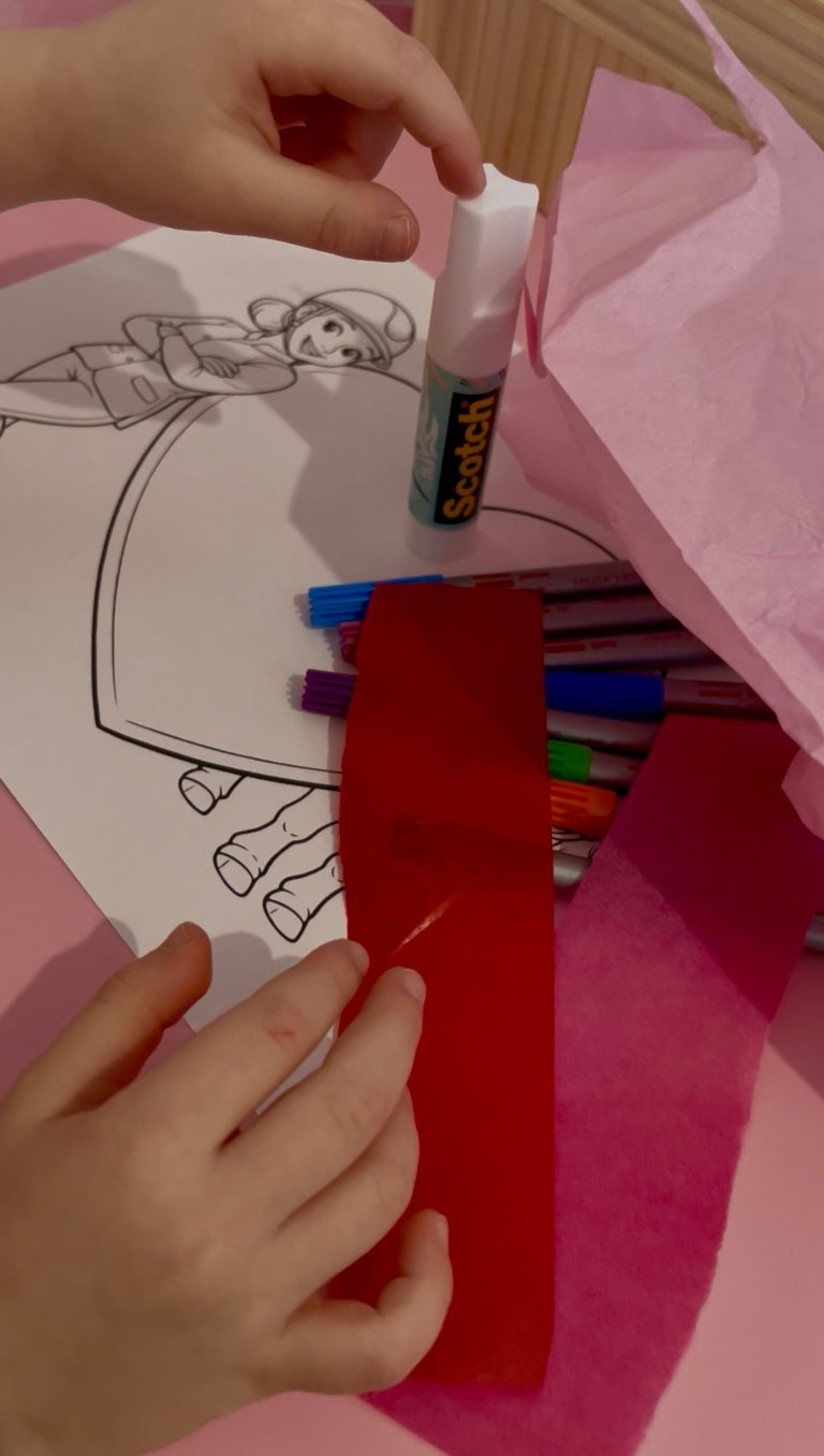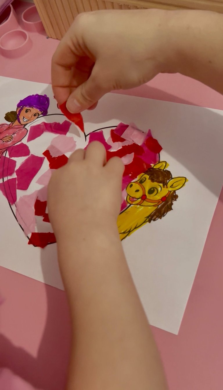Nun wird das Herz mit Klebestift bestrichen und die bunten Papierschnipsel werden darauf geklebt. Dadurch entsteht ein wunderschöner, leuchtender Effekt.