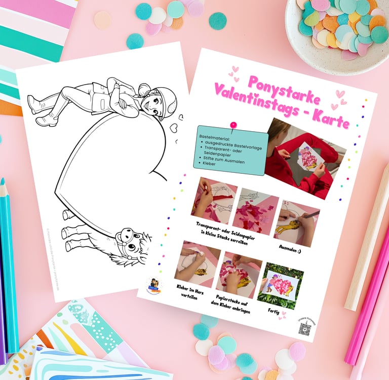 Mit unserer kostenlosen Bastelvorlage mit Pony Pancake und der Ponytante können Kinder ganz einfach eine persönliche und liebevolle Valentinstagskarte gestalten. Das große Herz in der Mitte bietet viel Platz zum Ausmalen, Bekleben und kreativen Gestalten - so entsteht ein einzigartiges und persönliches Geschenk von Herzen.